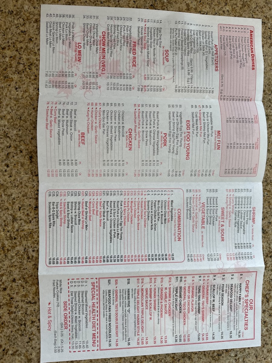 Sweet and sour chicken balls, choice of white or fried rice, various lo mein options including shrimp, chicken, beef, pork, or vegetable.