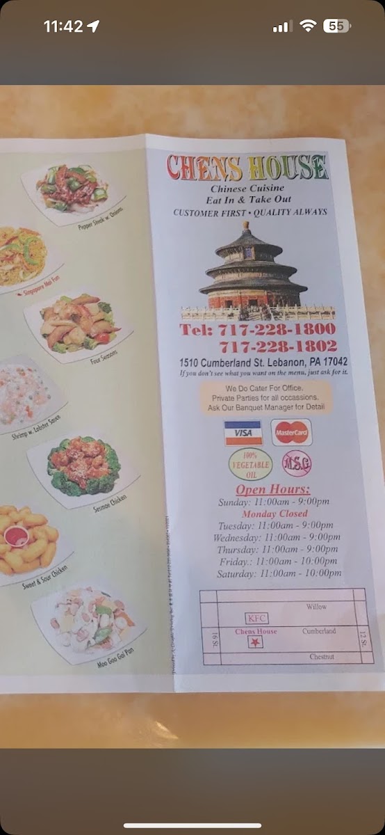 Roast pork, crisp broccoli, available in pint or quart. Choose between fried or white rice, shrimp, chicken, beef, pork, vegetable, or plain lo mein.